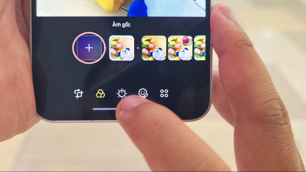 Hãy chắc rằng bạn đã tải các cảnh phim yêu thích xuống sẵn Galaxy A36 5G. Trong ví dụ, mình sử dụng bộ lọc ảnh đầy màu sắc của hoạt hình Ghibli để chỉnh bức ảnh chụp hoa và gấu bông của mình. Đầu tiên, hãy mở bức ảnh mà bạn muốn áp dụng filter lên, nhấp vào biểu tượng “cây bút”.